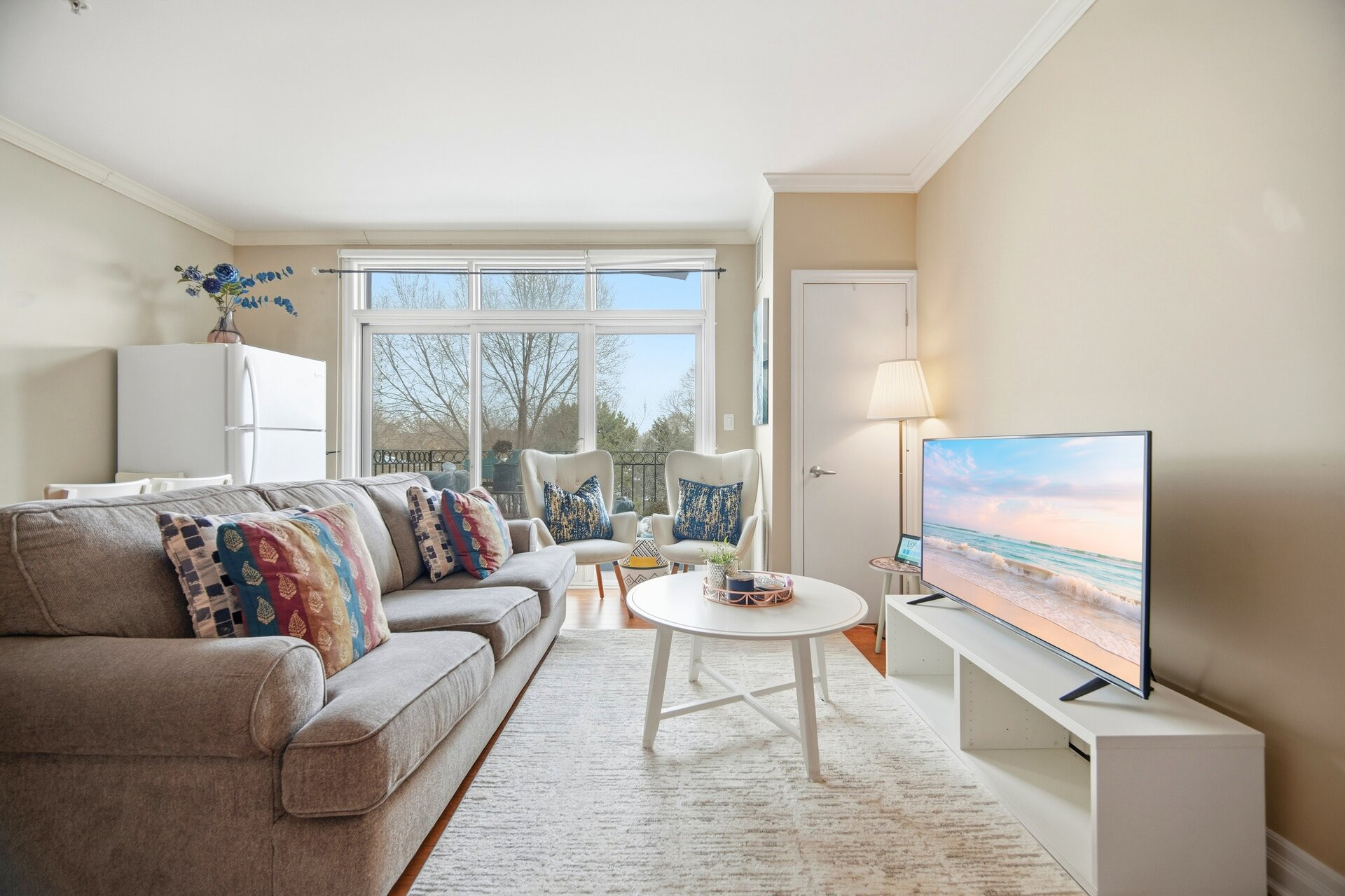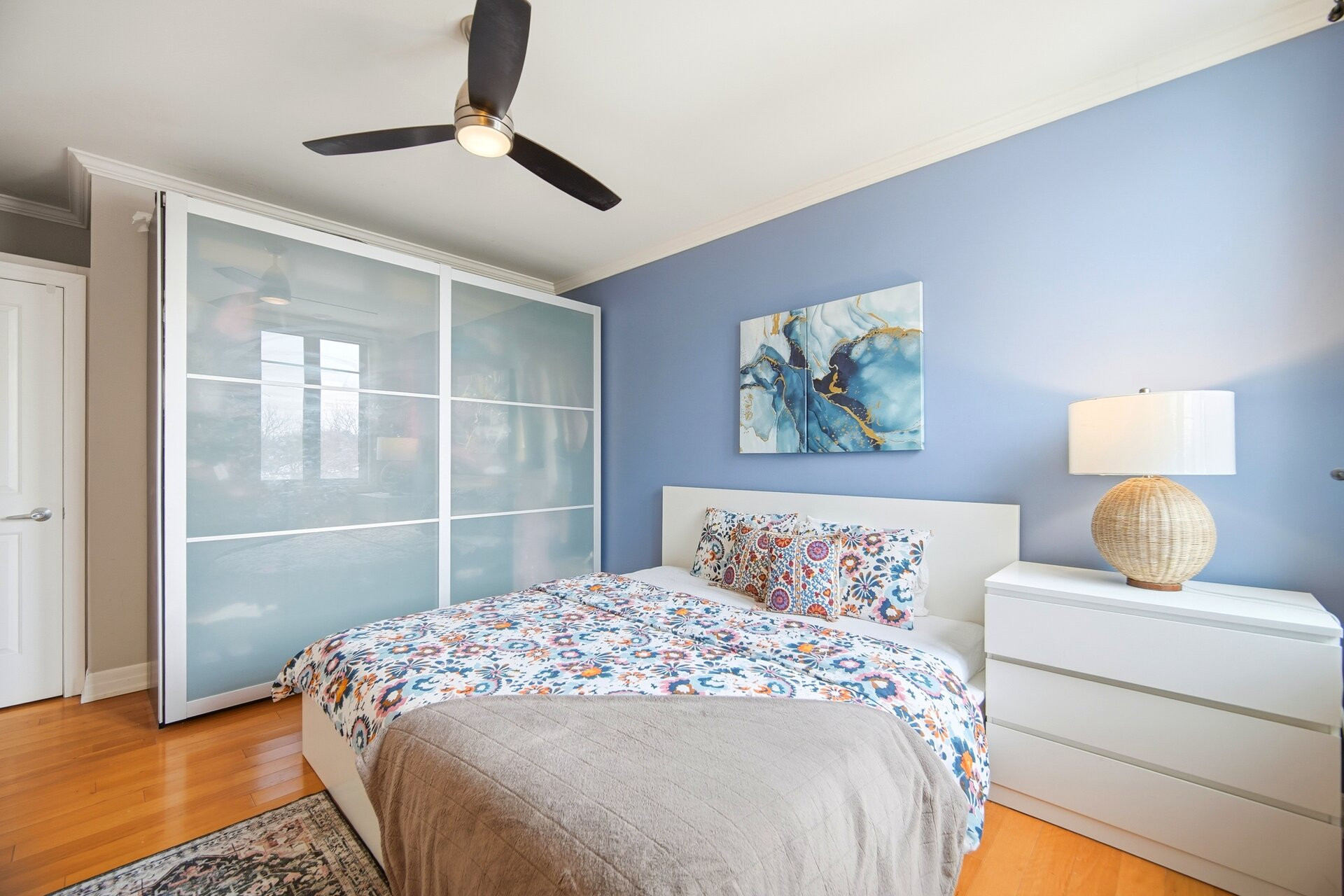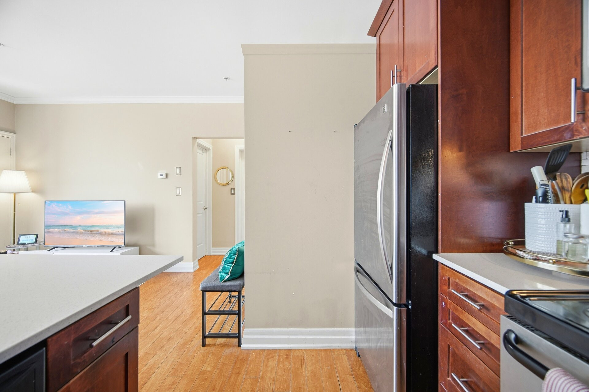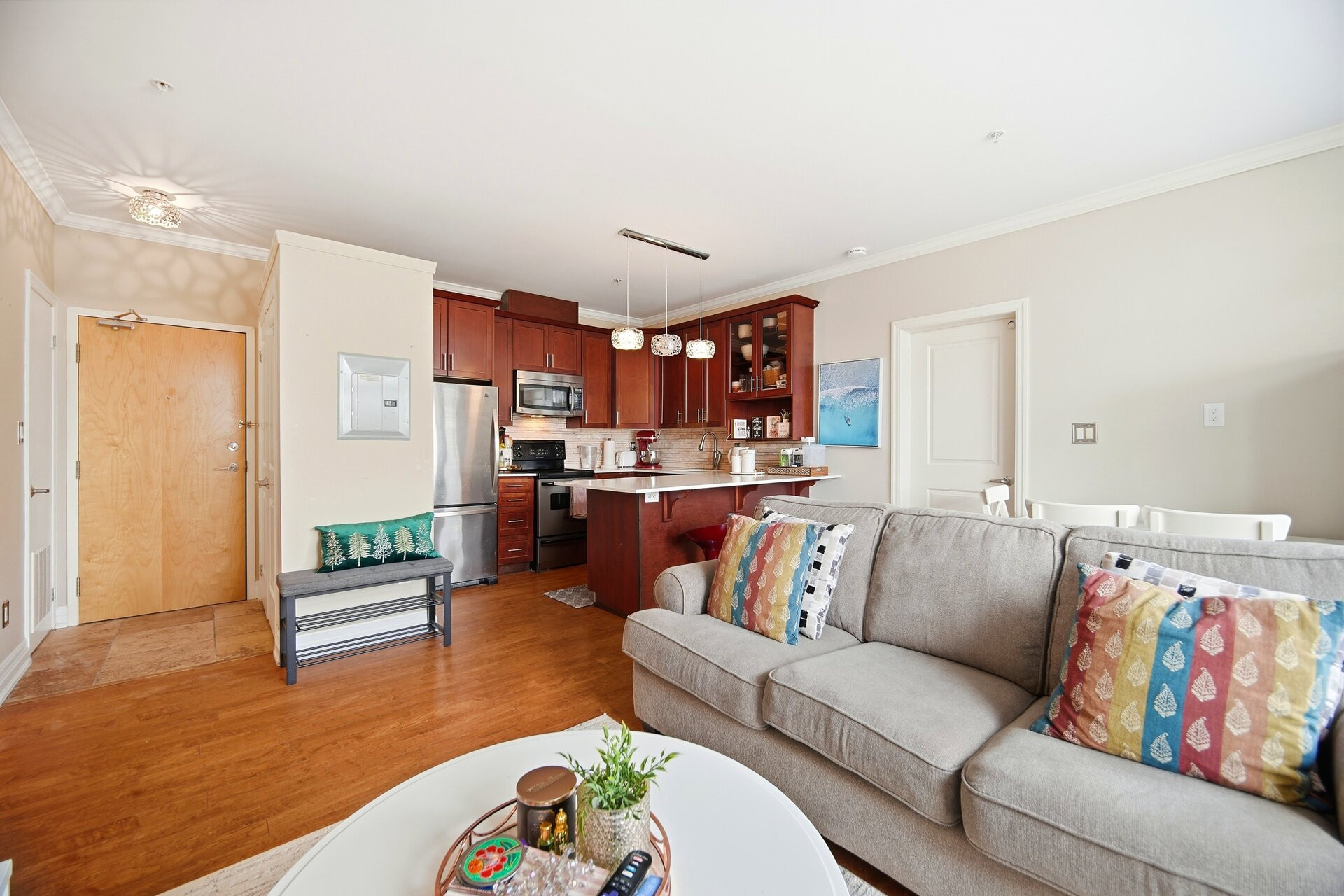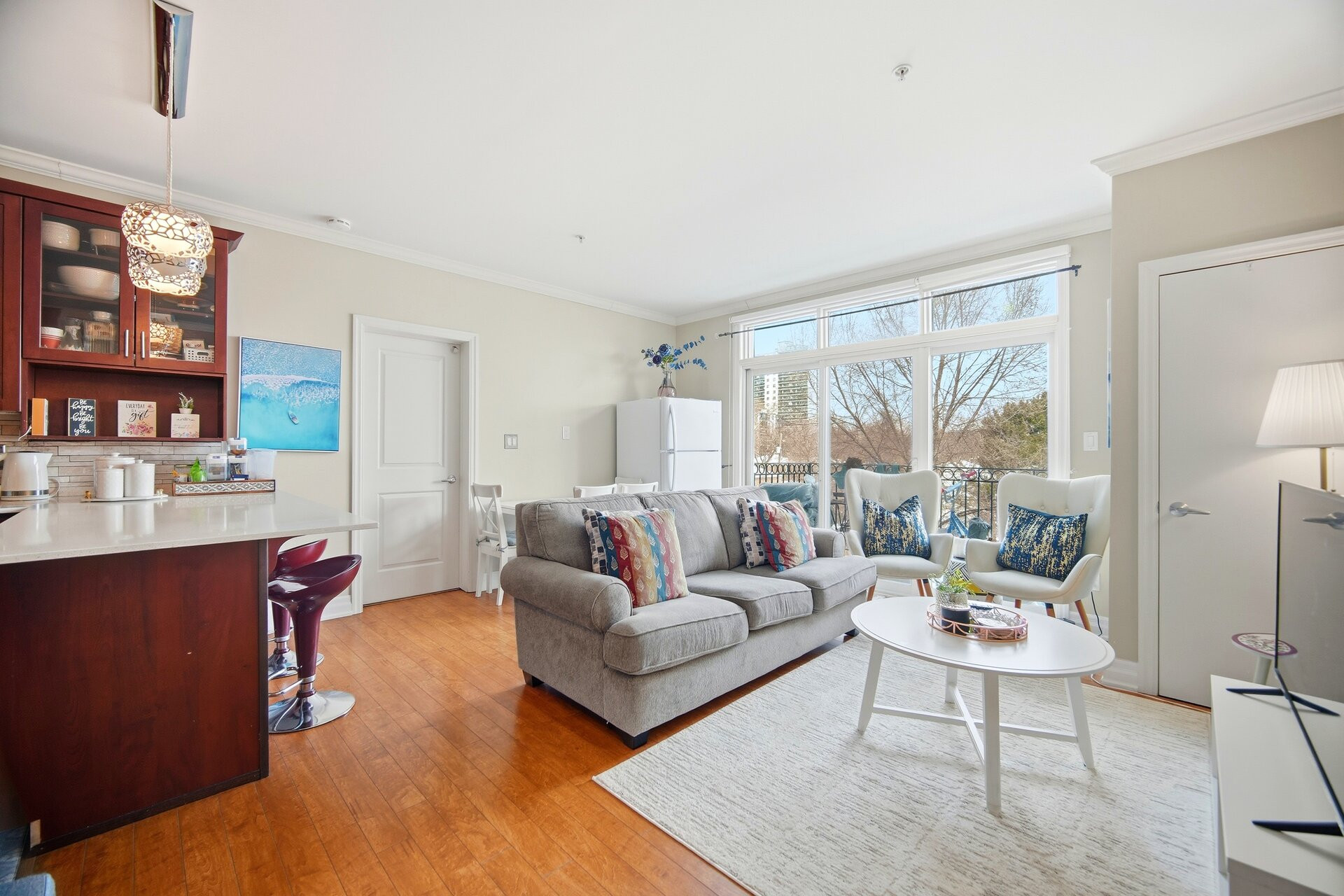 Welcome to this bright and beautifully laid out 2-bedroom condo in the heart of vibrant Kerr Village in charming Oakville. Offering 750 sq. ft. of functional living space, this well-maintained suite is perfect for buyers seeking an unbeatable walkable lifestyle. From the moment you step inside, you'll notice how naturally the space flows into an open-concept living and dining area filled with natural light, ideal for both relaxing and entertaining. The thoughtfully designed kitchen offers ample storage and workspace, quartz counters, and a breakfast bar. Both bedrooms are generously sized and thoughtfully positioned for privacy and comfort. The primary bedroom offers plenty of space for additional storage, creating a calm retreat at the end of the day. The second bedroom is equally versatile - ideal as a guest room, nursery, home office, or creative space - giving you the flexibility to adapt the home to any lifestyle as your needs evolve.